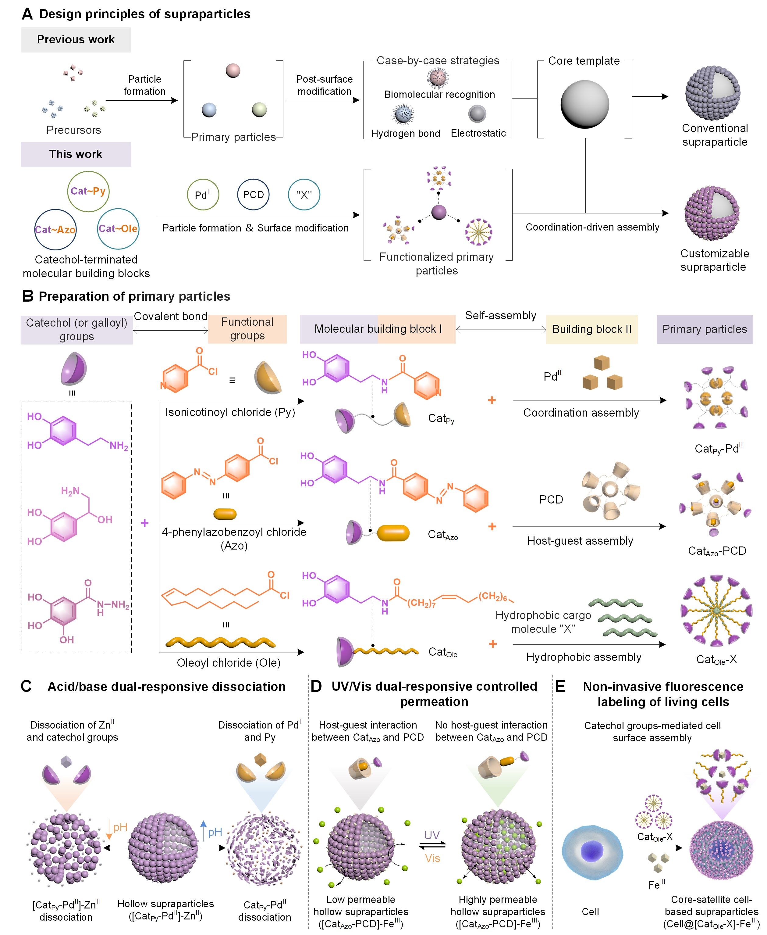 该团队首先将邻苯二酚基团与多种功能基团偶联,包括异烟碱酰氯(Py)、4-苯基偶氮苯甲酰氯(Azo),油酰氯(Ole),形成以邻苯二酚为末端的母体分子单元。该母体分子可以通过多种分子间相互作用(即金属络合、主客体相互作用和疏水相互作用)获得初级纳米颗粒(图1B)。这些初级纳米颗粒包含丰富的邻苯二酚基团,因此可以进一步通过多酚与金属络合作用实现二级超结构颗粒构建。该团队证明了,通过将不同的功能基团与邻苯二酚基团结合,可以获得具有一系列功能的超结构颗粒,如酸碱双pH响应性(图1C)、光控渗透性(图1D)和膜非损伤的细胞标记(图1E)。该研究为构建具有可定制化功能和多层级结构的超级颗粒系统提供了新的策略和研究思路。该文通讯作者为郭俊凌教授和龚贵东副研究员(专职科研),第一作者为轻工DB游戏