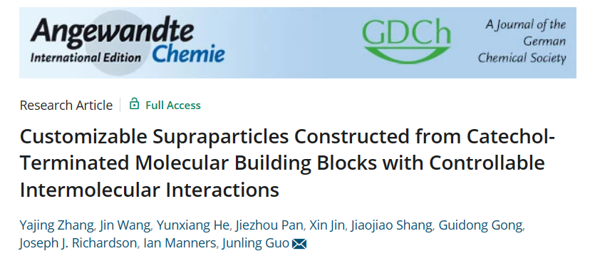 郭俊凌教授团队在国际化学顶级期刊Angewandte Chemie International Edition发表题为:Customizable Supraparticles Constructed from Catechol-Terminated Molecular Building Blocks with Controllable Intermolecular Interactions的研究。多层级自组装策略对于深入理解从分子、纳米到宏观尺度的组装过程具有重要意义,同时也为构筑先进智能材料提供了可靠的途径。随着材料化学的发展,引入纳米颗粒作为基本构筑单元为超结构颗粒的设计开辟了新方向,此类研究多集中于对颗粒表面进行修饰从而赋予颗粒间驱动力以实现自组装。然而,在这些传统方法中,纳米颗粒的合成与表面修饰是分离的两个步骤,很大程度上增加了自组装材料的合成复杂性和应用难度。