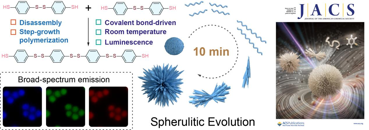 近日,四川大学周加境研究员与加州大学圣地亚哥分校Jesse V. Jokerst教授团队合作,开发了一种在常温下通过小分子均聚和自组装形成的球形晶体聚合物(rPBDT),研究了其组装机理并证明了其用于可示踪药物载体的潜力,该研究成果以题为“Self-Assembled Homopolymeric Spherulites from Small Molecules in Solution”发表于国际化学顶级期刊《Journal of the American Chemical Society》(川大A-),并入选封面论文。研究以小分子1,4-苯二硫醇(Benzene-1,4-dithiol,BDT)为原料,BDT分子的巯基首先在碱性缓冲溶液中形成双硫键,进而逐步聚合形成聚合物链,苯环间的π-π堆积导致聚合物链组装成超分子纳米粒子(PBDT)。PBDT不仅尺寸均一(70.8 ± 8.7 nm),还可以通过种子生长法进一步生长至450 nm。将PBDT纳米粒子置于良溶剂二甲基甲酰胺(DMF)中,苯环间的π-π堆积被破坏,导致PBDT分散并暴露出活性巯基,从而通过双硫键进一步的逐步聚合形成分子量更大的聚合物链并最终结晶形成球晶(rPBDT)。该溶解和逐步聚合的过程可以在1 min内实现。通过监测rPBDT的生长过程,研究发现rPBDT链首先组装成单个尖刺,然后多个尖刺从同一个中心生长形成束状,最后大量尖刺从中心延伸发散,组装形成准球形的rPBDT球晶。通过改变PBDT纳米粒子的浓度,可制备具有不同尖刺数量的rPBDT球晶。此外,rPBDT球晶还具有优异的溶剂稳定性,在四氢呋喃(THF)中多次浸泡,形貌几乎没有改变。研究还发现,rPBDT具有在球晶领域鲜有报道的荧光特性,其原因可能是刚性双硫键和超分子结构的存在导致了聚合物链上的苯环旋转受阻,进而形成簇聚诱导发光(Clusterization-triggered emission,CTE)的现象。体外细胞毒性实验证明rPBDT球晶具有优良的生物相容性,表明其作为可示踪药物载体的巨大潜力。围绕rPBDT球晶自组装机理的研究证明了共价键在球晶形成过程中的重要作用,这也是以往研究工作中容易忽视的一个方面。