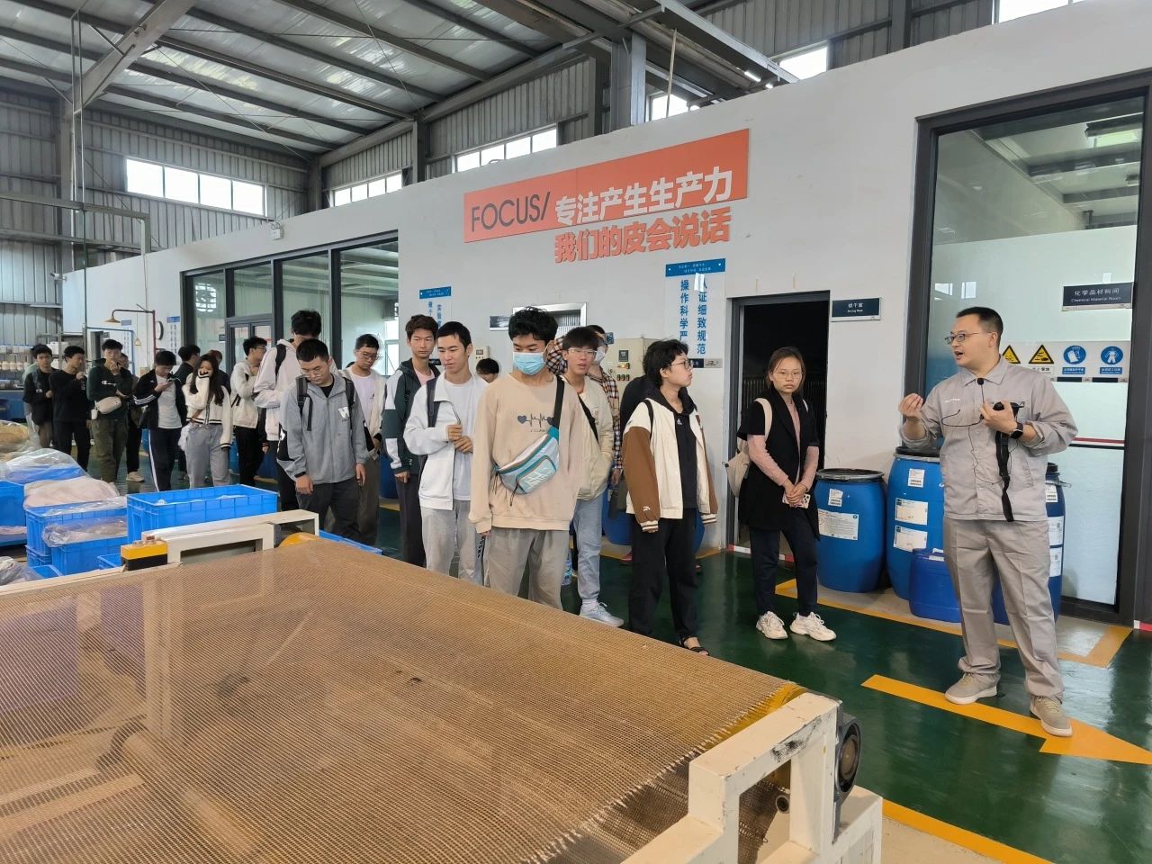 四川德赛尔新材料科技有限公司成立于1994年,总部位于四川省德阳市。作为一家集基础研究、应用研究、服务性制造的科技型新材料公司,德赛尔通过材料链接美好生活,以研发皮革助剂、加脂剂、复鞣剂、酶制剂、涂饰剂为专长,致力于全方位为客户生产提供各种通用的高品质皮革、毛皮化学品及需求精准服务方案。上午,同学们抵达德赛尔公司后,公司分四组先后参观了公司行政区、研发中心、检测中心以及技术应用中心,实地了解了现代制革企业的工作环境、技术应用创新模式以及皮革产业链等行业相关信息。