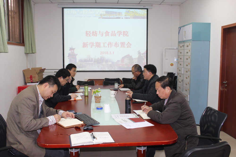 何有节院长也首先就假期工作做了简要回顾,就这学期的一些重点工作如专业名称、学科发展、评估及认证工作、目标任务书的分解等做了部署,就本学期的一些具体事务做了安排。彭必雨副院长围绕本学期的核心工作本科教学的审核评估谈了谈本学期工作的具体计划:如“大创”项目的申报,课堂质量的管理,专业自评、自评结果的应用,各类报奖中存在的差距、问题和解决办法,接着彭院长提出近期的重点工作有三:1.完善制度;2.顺利通过本科教学评估;3.某些薄弱环节的工作应有所突破。何强副院长就自己分管的研究生和科研工作做了简要总结,提出了工作当中的一些思考:1.如何留住优秀生源;2.如何提高毕业研究生的质量;3.如何更好地加强科研转化;4.通报食品系工程认证工作及中韩会议工作的相关事宜。冯国涛副书记就分管的学生工作和纪委工作做发言,就本学期的一些重点工作,如转专业工作、就业工作、创新创业工作、党风廉政建设等工作谈了谈工作思路。最后肖凯副院长就自己分管的国资、行政、教辅、工会等工作讲话,特别就公房改革、行政人员绩效分配、教辅队伍建设、实验室安全稳定等工作做了强调和安排。