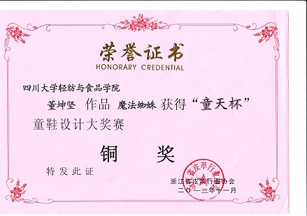 日前,由浙江省皮革行业协会主办、浙江宝路鞋业有限公司承办的第二届“童天杯”童鞋设计大奖赛落下帷幕。经过专家们的精心评选,最终确定了金银铜奖得主。DB游戏 革制品设计方向2010级本科的董坤坚的设计作品《魔法蜘蛛》获得了本次大赛的铜奖。期望同学们再接再厉,取得更优异的决赛成绩。姚云鹤供稿