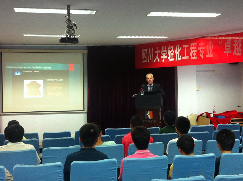 院长何有节教授向Fabrizio先生致欢迎词,并向其赠送了礼品。在随后的研讨会上,Fabrizio首先与同学们一起回顾了真皮革与合成革的历史沿革,系统归纳了两类革制品的制造方法,同时引导大家总结了两者各自的优缺点。为了帮助同学们深刻理解真皮革与合成革制造工艺的异同,Fabrizio先生还特意为大家播放了相关视频,其中所涉及的德国某制革厂全自动生产设备及合成革高效生产工艺引起了同学们的浓厚兴趣。最后,Fabrizio先生基于自身在制革业长达30余年的从业经历对真皮革与合成革的未来发展趋势进行了展望,给到场的同学留下了启示,也激励了大家的专业学习兴趣。