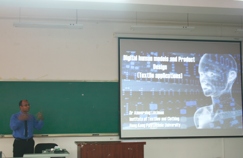 的学术讲座主要是介绍了人体数字建模的含义,人体测量及人体数字建模对服装设计及纺织服装领域中的应用。同时,Dr. Luximon也介绍了人体工效学对鞋的设计作用,鞋的创造性设计及流行趋势等,令到场的师生深受启发。报告结束后,Dr. Luximon就师生感兴趣的内容现场进行了交流和讨论。