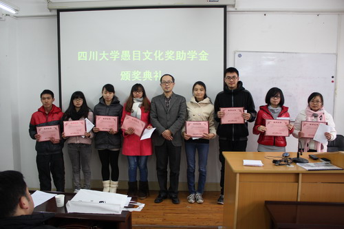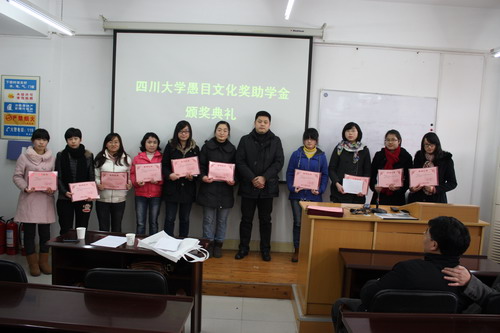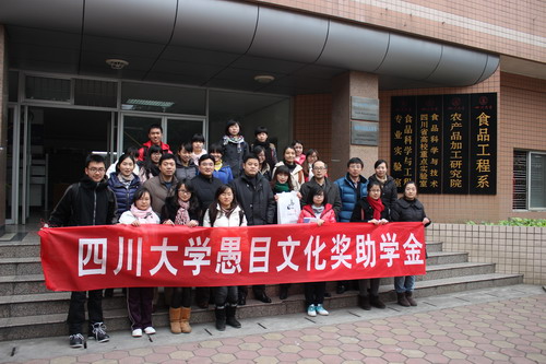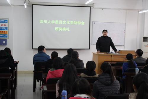 2012年12月28日中午1点,2012年度四川大学愚目文化奖助学金颁发仪式在食品工程系纺工楼202多媒体教室顺利举行,参加颁发仪式的有成都愚目文化传播公司周志明总经理,轻纺与食品DB游戏