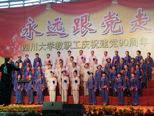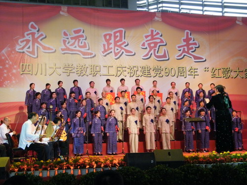 为纪念中国共产党建党90周年,5月27日下午,四川大学教职工“红歌大家唱”歌咏比赛在望江校区体育馆隆重举行。校党委书记杨泉明教授,校党委常务副书记罗中枢教授,校党委副书记周学东教授,校党委副书记、纪委书记徐兰教授出席了大赛。来自全校40个部门和单位的5000余名教职工参加了歌咏比赛。开幕式由校党委常务副书记罗中枢教授主持。 校党委书记杨泉明教授在开幕式上讲话,在全场高声齐唱《没有共产党就没有新中国》的雄壮歌声中,“红歌大家唱”歌咏比赛正式拉开序幕。DB游戏