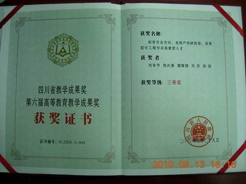 何有节、陈武勇、廖隆理、刘彦、徐波等五位教师的《拓宽专业方向,发挥产学研优势,培养轻化工程专业高素质》获四川省第六届高等教学成果三等奖。