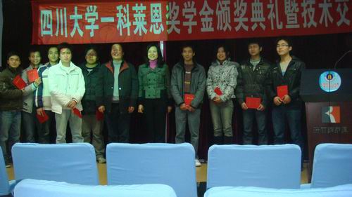 2009年12月24日19:00四川大学-科莱恩奖学金颁奖典礼暨技术交流活动在皮革楼二楼报告厅隆重举行,参加本次活动的有科莱恩化工(中国)有限公司广州分公司皮革部经理李艳女士;科莱恩化工(中国)有限公司广州分公司皮革部涂饰实验室经理、皮革系96级校友康海生先生;轻纺与食品DB游戏