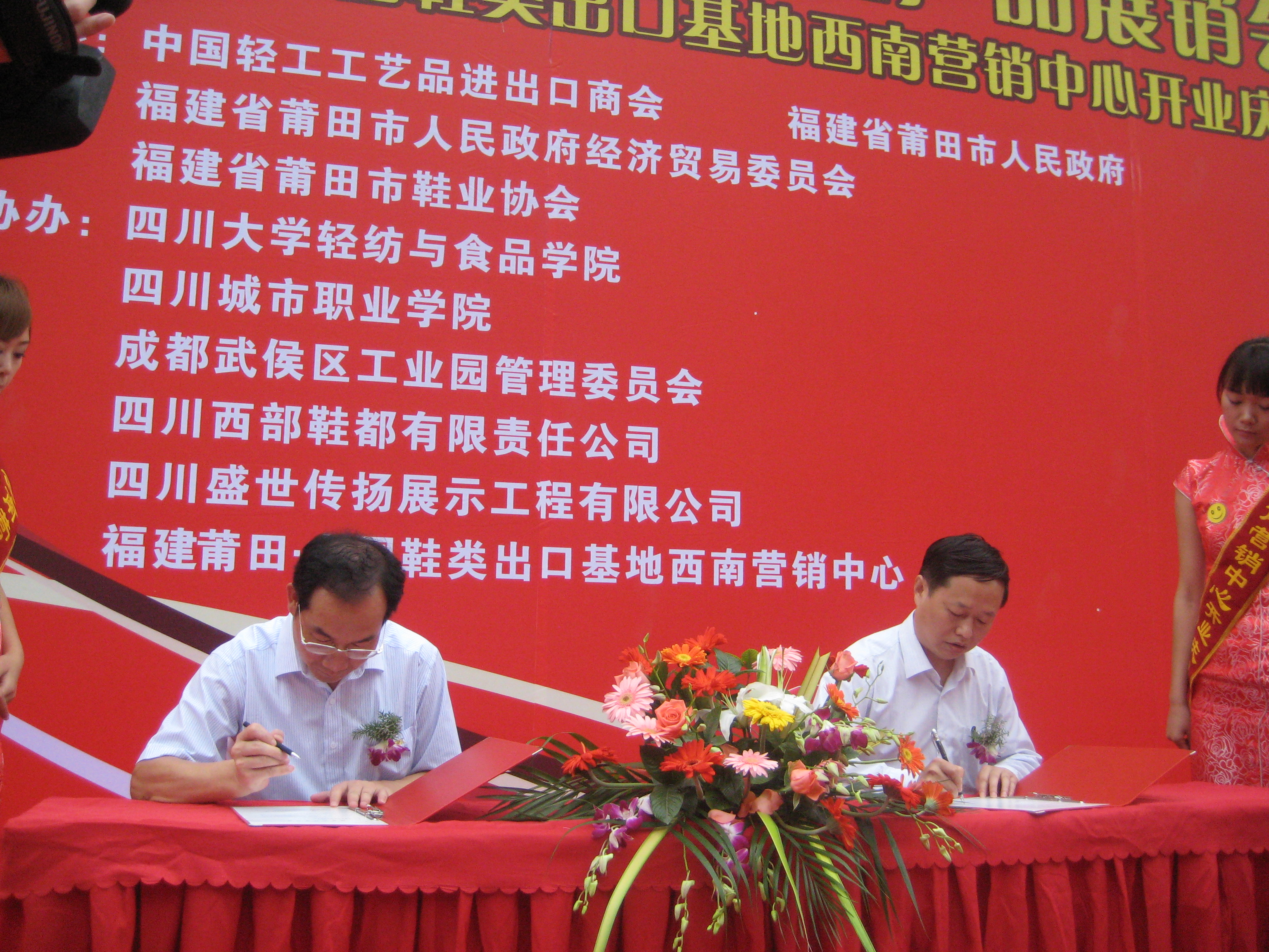 何有节副院长代表合作双方签署了《战略合作协议书》。双方本着优势互补、互惠互利、共同发展的原则,商定结成战略合作伙伴关系。 中国轻工业进出口协会副会长王忠奇,成都市经贸委、莆田市经贸委、成都市武侯区工业园管理委员会、四川西部鞋都有限责任公司、四川大学轻纺与食品DB游戏