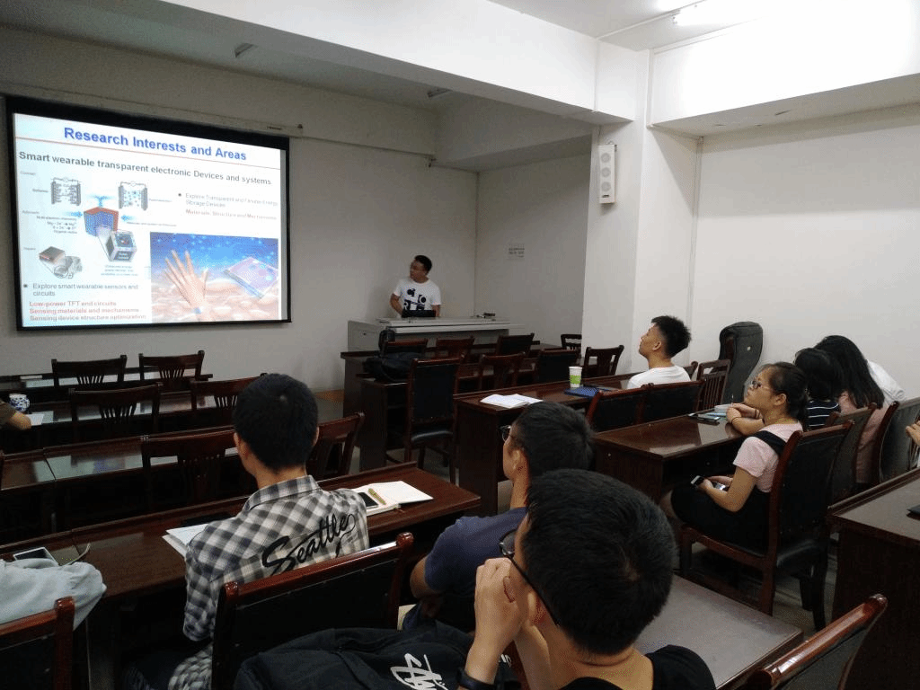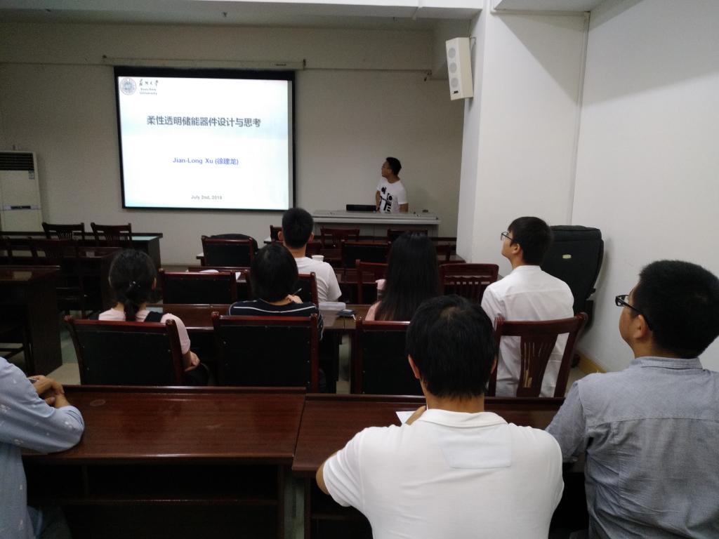 2018年7月2日,苏州大学的徐建龙老师,在纺工楼A303教室做了题为“柔性透明储能器件设计与思考”的学术报告。报告由我院纺织与服装工程系陈胜副教授主持并致欢迎词,阎斌研究员、成煦副教授、谭淋副研究员、林义博士等老师和各实验室的研究生、本科生聆听了徐建龙老师的精彩报告。