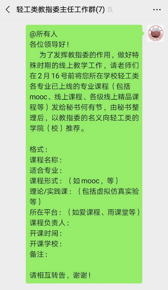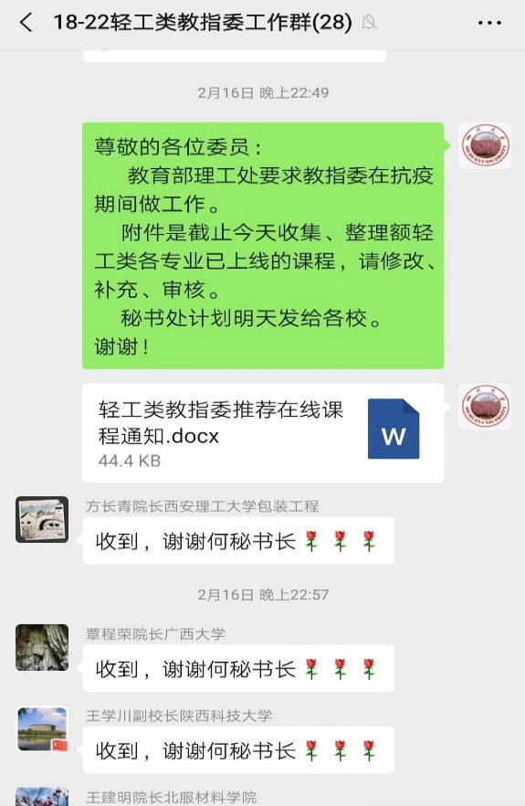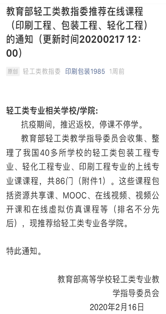 作为教育部高等学校轻工类专业教指委主任委员单位,在教指委主任石碧院士的组织策划下,于2月10日起收集整理全国轻工类各高校的在线专业课程资源,经教指委主任网络会议集中审议通过后,以轻工类教指委的名义向全国轻工类院校及专业推荐使用,并得到各轻工类院校及专业的积极响应和推广。