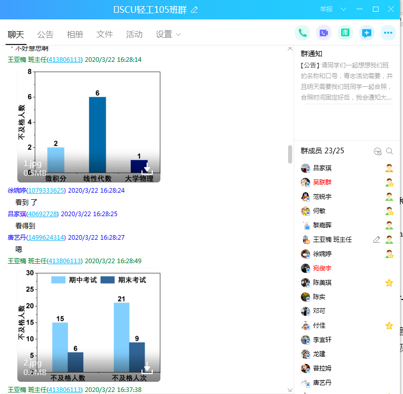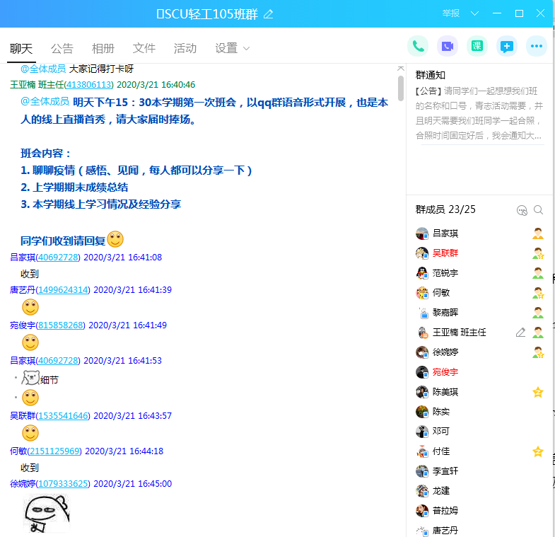 还有很多,王亚楠副教授担任本科生课程《制革概论》(全英文)线上教学工作,同时也是轻工类专业2019级105班班主任 。3月22日王老师组织全班同学召开线上班会,和同学们深入交流,一方面对上学期期末成绩总结,分析同学在年级的排名区间,敦促不及格同学好好准备补考;另一方面也关注学生成长,关注他们所思所想,每人线上分享疫情期间的感悟和见闻,最后对如何高效上网课王老师和学生们热烈讨论、交流分享,整个班级精神面貌和状态丝毫没有受到疫情影响。