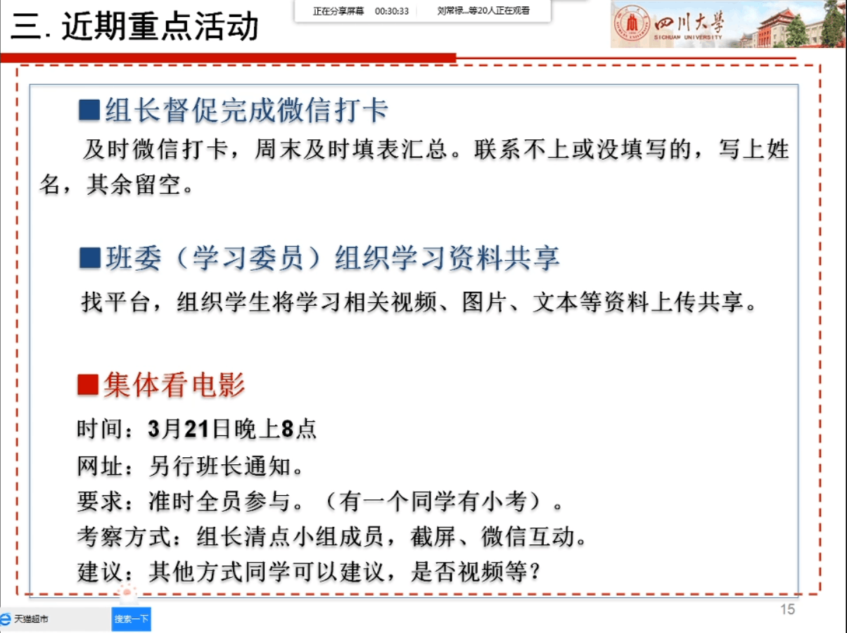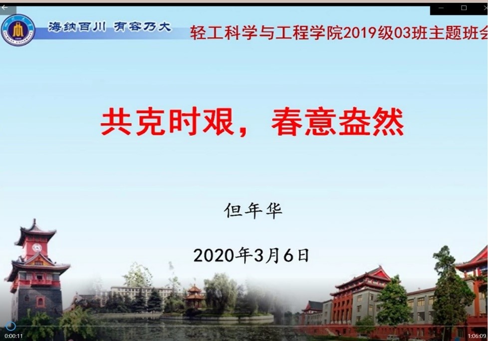开学后,但年华老师担任研究生课程《生物学科学与工程导论》网络教学工作,发现网上上课有利有弊,那些2019级孩子们能不能适应网上教学,“宅家”怎么样安排好学习?这一直是他挂念、操心的事,简单的叮嘱学习,或是教孩子们一些学习方法,好像还缺少点什么?这样特殊时期,应该传递给学生什么呢?但老师心里不断思量着,反复计划着,最后于3月6号精心组织策划一场 “共克时艰,春意盎然”主题班会,意在增强班级凝聚力。但老师首先向同学们介绍了新冠肺炎疫情状况,强调国家政策,嘱咐孩子们“宅家”做好防护,提醒他们做好学习规划。针对上学期学生学习情况,为更好相互督促鼓励,但老师将全班分成4个学习小组,以小组细化管理,在小组内部开展学生间视频语音交流活动和网上学习打卡,要求每周“沉浸式”学习至少1—2小时,每位同学填写《本周学习情况统计表》,由组长收集,班长汇总后交给班主任。此外,每两周开展一次主题班会,通过网上开展形式多样的集体活动,增强班级凝聚力。