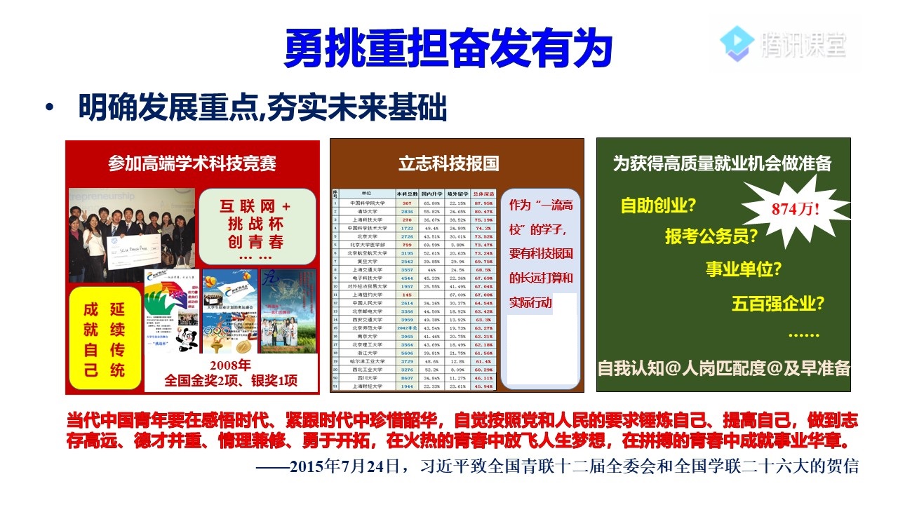 新冠肺炎疫情这场灾难是危机也是考验,是发展挑战更是人性磨炼。刘晓虎书记再次强调并要求同学们强化思想武装,不仅要做好校院的疫情防控工作,更要防范因外部势力把疫情政治化和污名化中国等引发的舆情,做到不信谣、不传谣、不造谣。作为大三学生,我们要立足当下,坚定理想信念,把人生理想融入国家和民族的事业中,把一流高校的培养优势转化为未来的发展优势,蓄积报效党和国家、人民的实力。2017级本科生现阶段更需要静下心来明确发展重点,夯实未来专业基础,学习之余积极参加高端学科竞赛,明晰自身发展路径,为获得高质量就业机会做足准备。