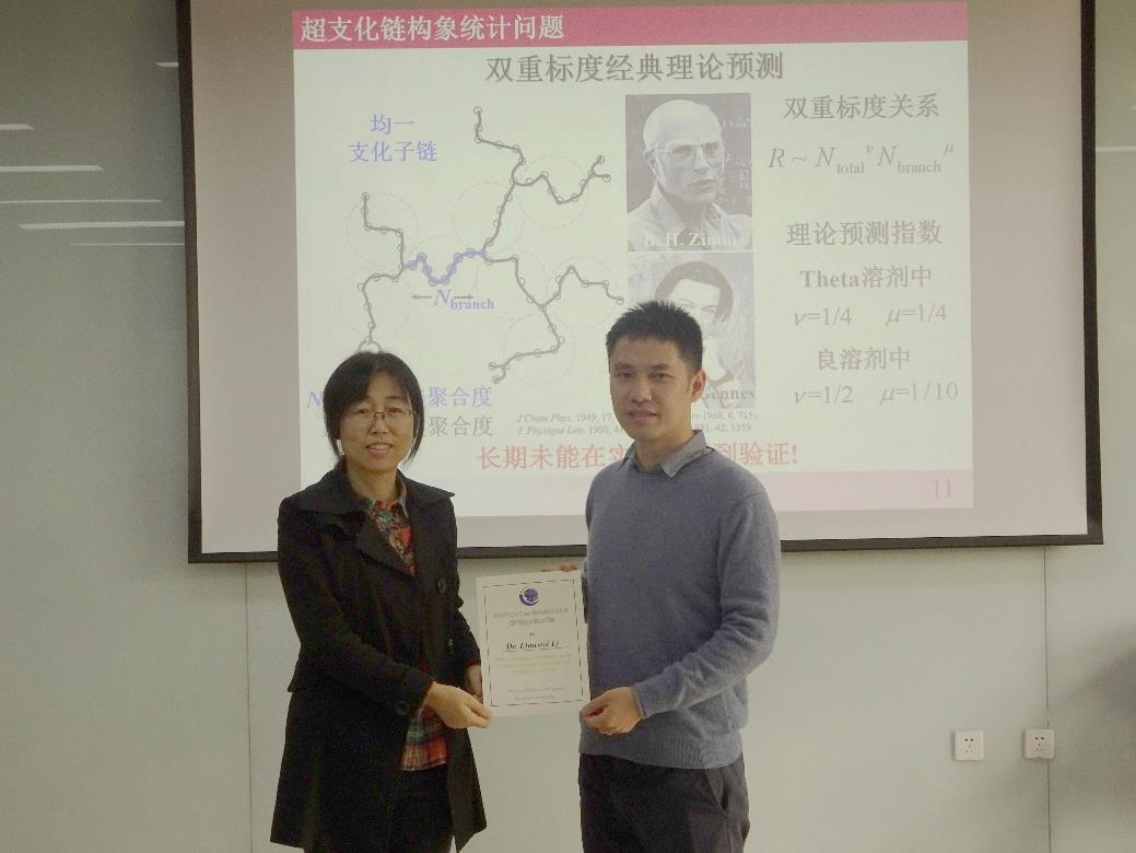 李连伟博士的报告不仅内容丰富,且涉及拓扑高分子溶液链行为这一基础高分子物理问题,同时,其展示了回答一个具体科学问题的明确研究思路,即,“以物理问题为导向,以合成化学为手段”。在问答环节,李连伟博士热情回答了与会师生的提问,现场互动交流气氛热烈。讲座结束,由生物质与皮革工程系系主任林炜教授为李连伟博士颁发了“生物质科学与工程论坛”证书。