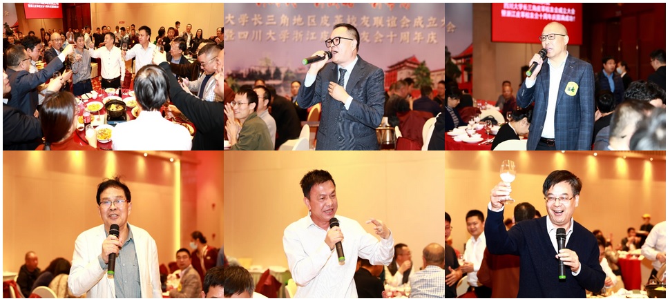 彭必雨副院长、四川大学江苏校友会聂圣哲会长、四川大学上海校友会王钢会长、四川大学浙江校友会王慧明会长和浙江校友会章少华副会长、陕西科技大学海宁校友会许建新会长、四川大学广东皮革校友会倪建荣会长、四川大学河北校友会孙晓刚会长等纷纷致辞讲话。四川大学生物质与皮革工程系2014级校友杜俊韬作了新校友代表发言。