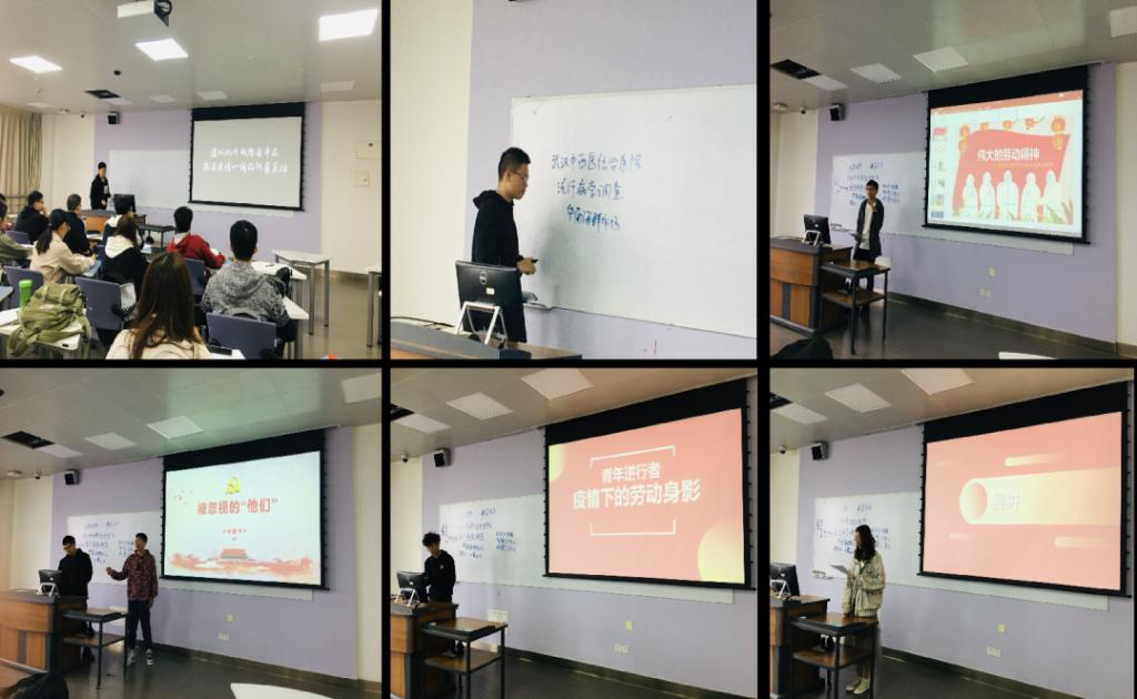 谢军同学以“伟大的劳动精神”为题代表第二小组做主题发言。谢军同学以幽默而深刻的语言极大调动了会场氛围,以设问形式引发同学们思考和讨论,并从钟南山院士在火车上不辞辛苦赴武汉画面引出劳动价值话题,通过焦点访谈视频画面中社区工作者劳动行为进一步启发同学们认识到为他人、为集体、为国家劳动才是有价值的劳动,有奉献精神的劳动才是我们青年一代所要追寻劳动。