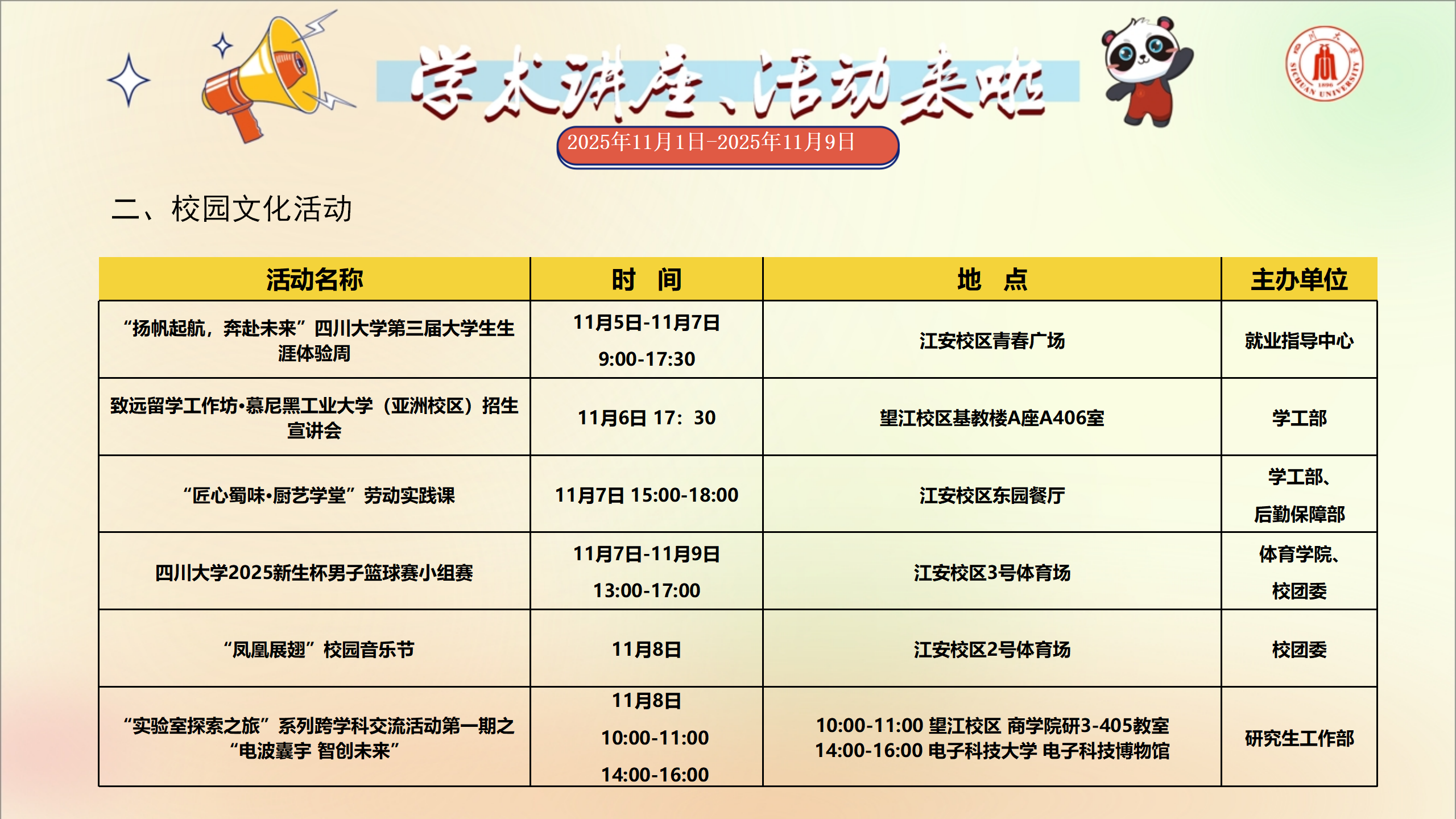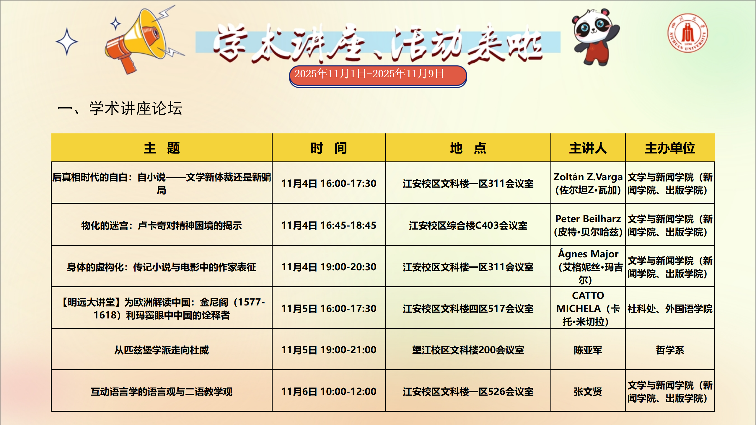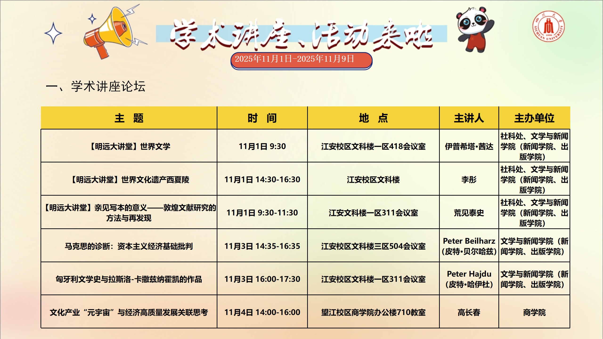 学术讲座和校园文化活动预告(2025年11月1日-2025年11月9日)
