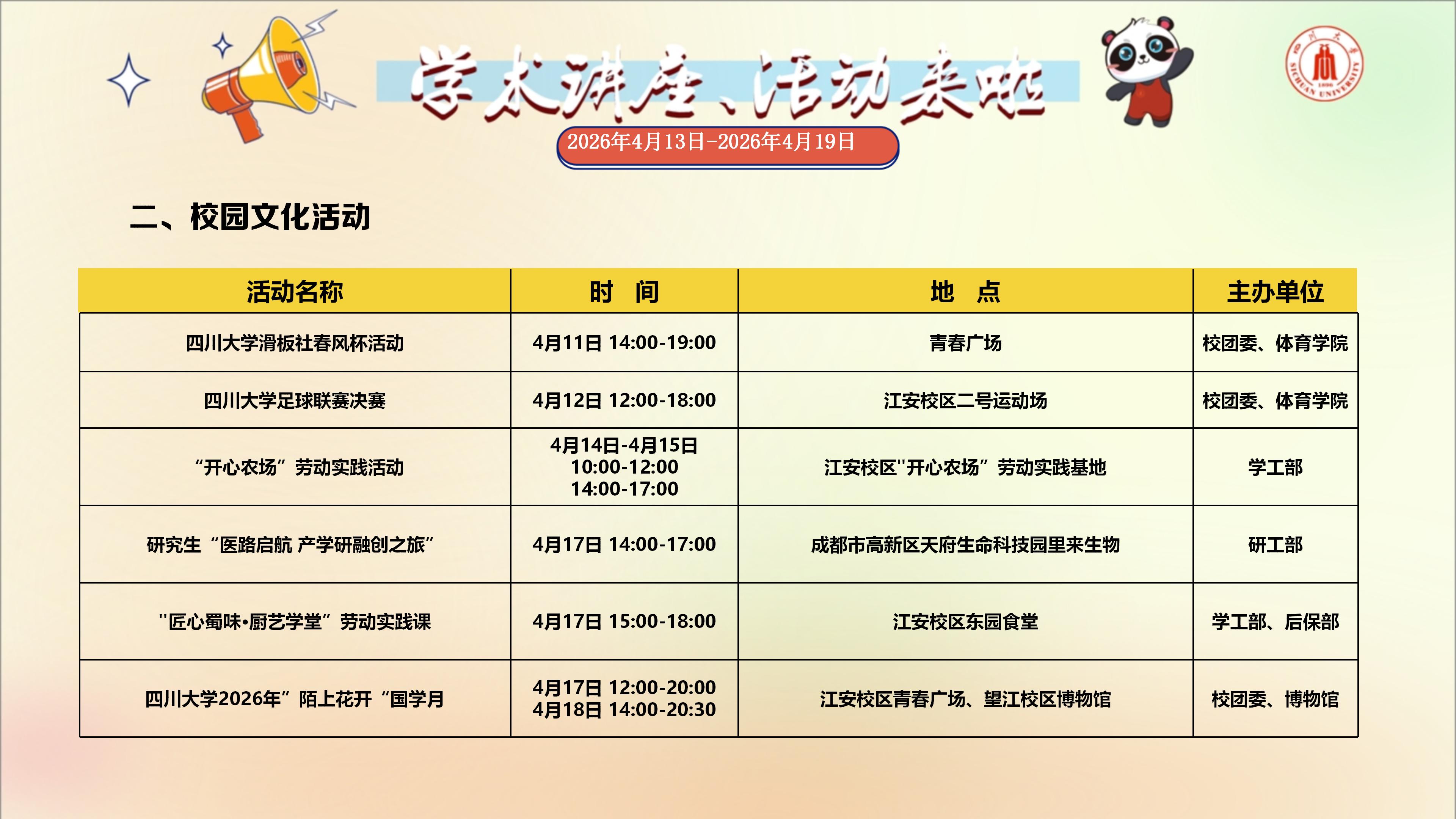 学术讲座与校园文化活动预告(2026年4月13日-2026年4月19日)