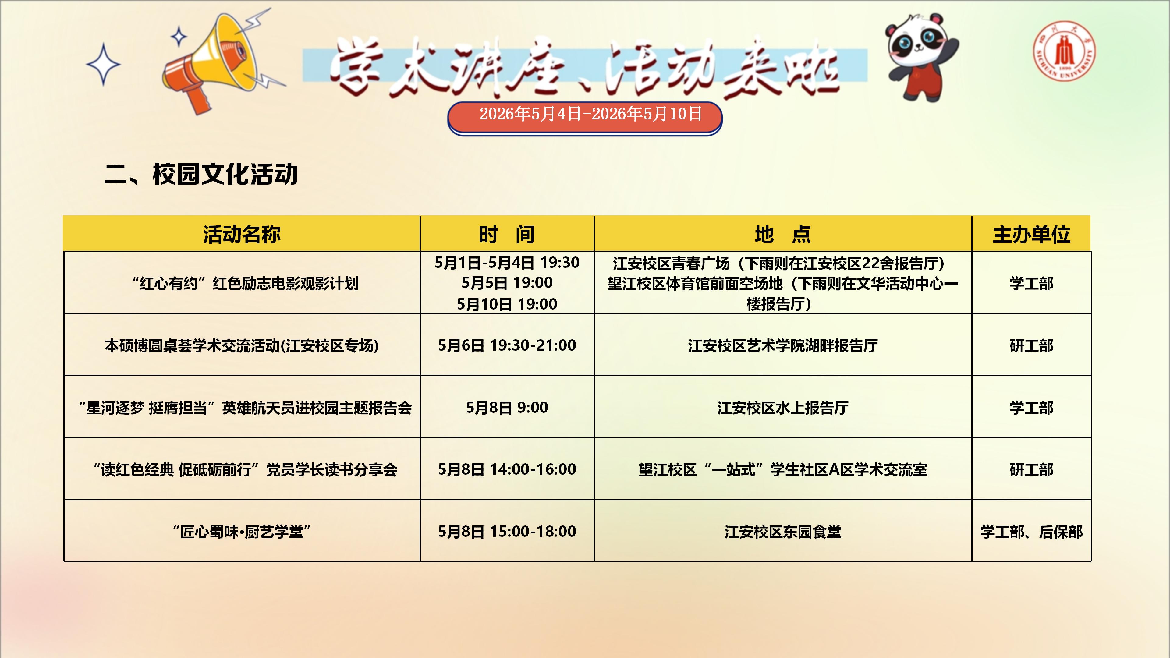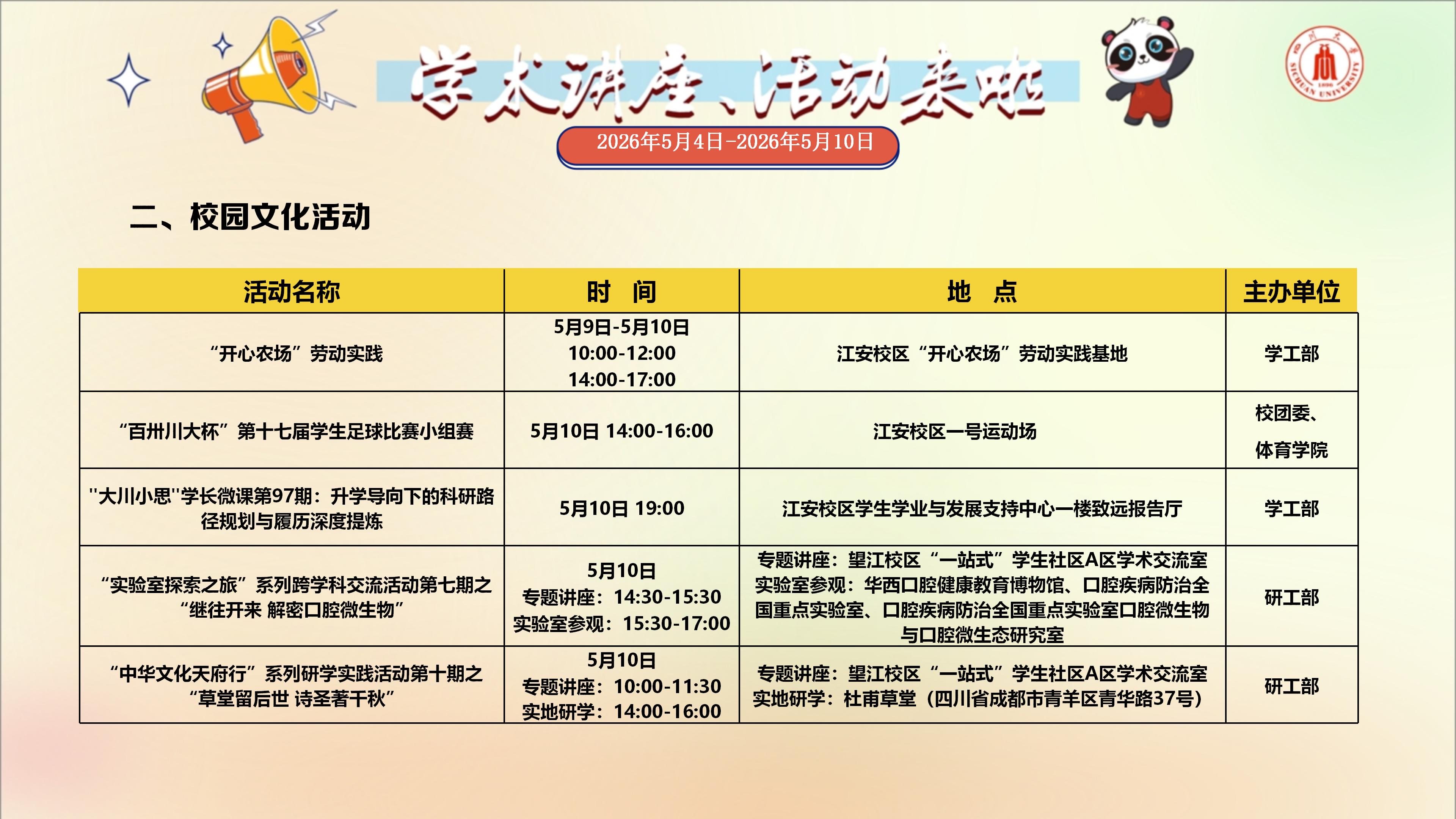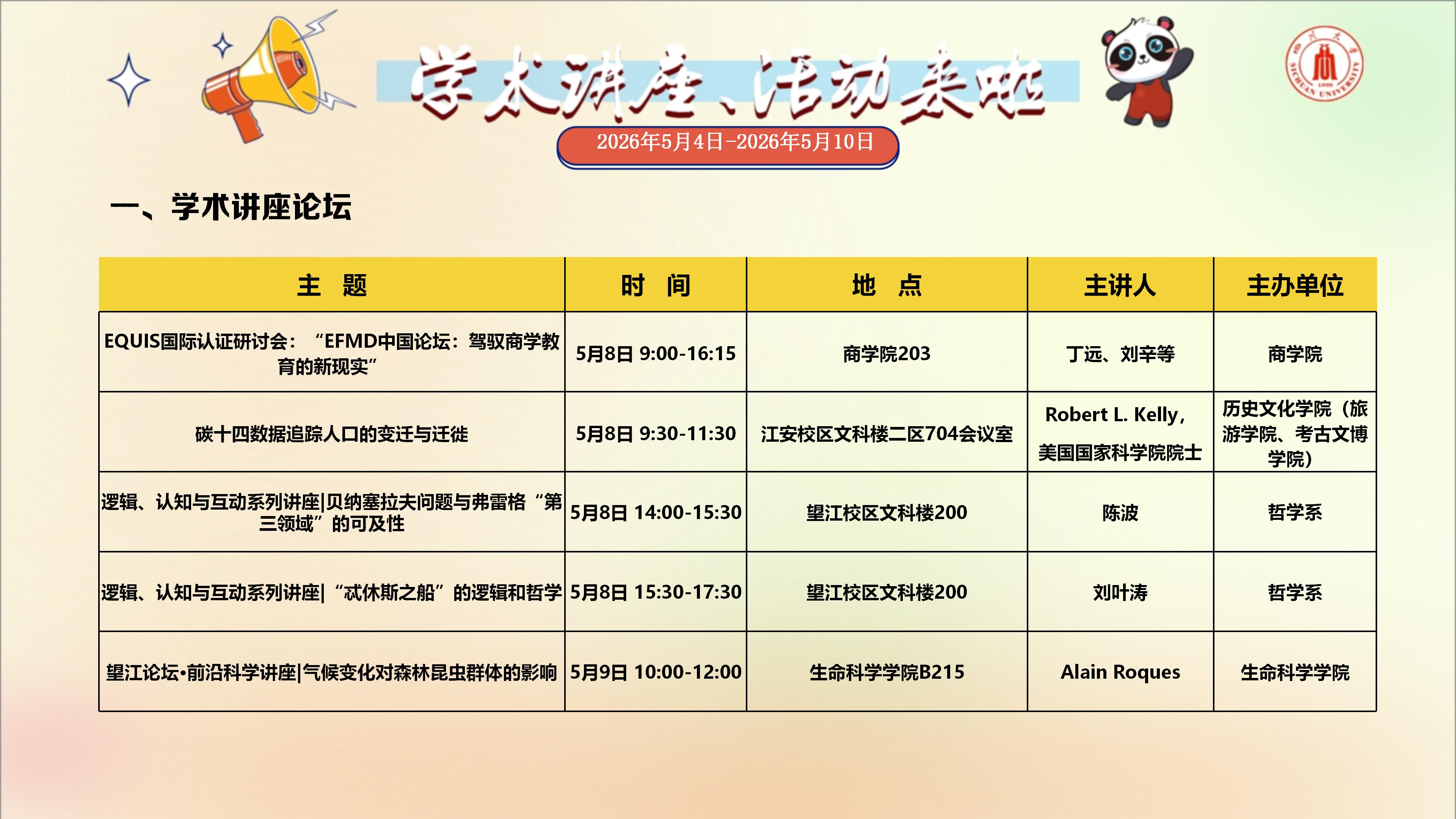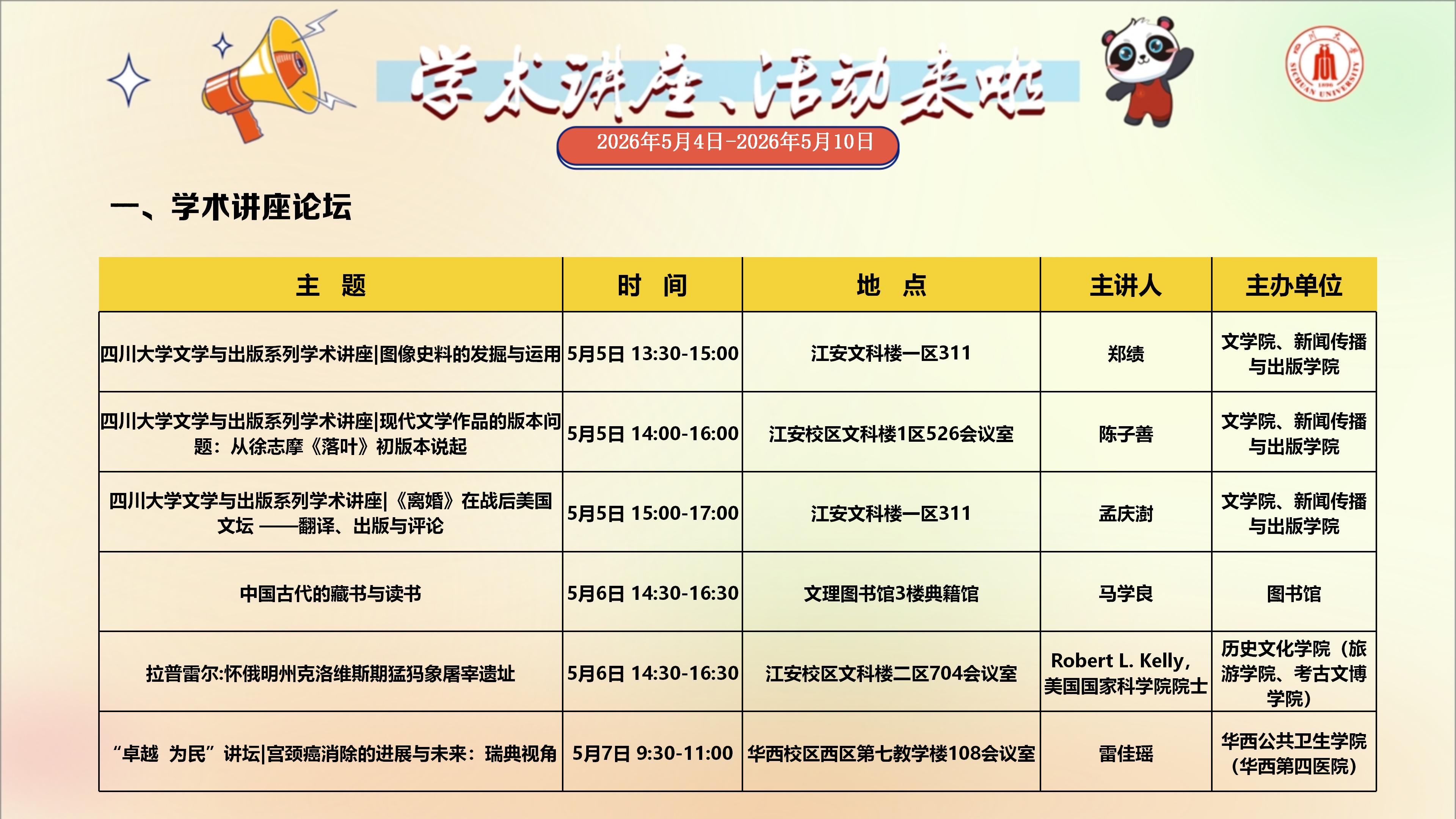学术讲座与校园文化活动预告(2026年5月4日-2026年5月10日)